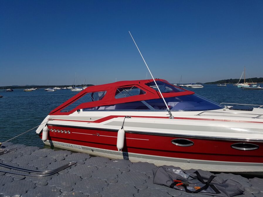 The Camper is supplied as original, manufactured from a choice of Sunbrella Plus fabric… The cover gives Full Standing Height in the cockpit, and is designed to create an additional living space in the entire cockpit. This particular version, covers from the top of the windscreen to the rear of the cockpit, supplied with Sun Awnings, removable screen, sides and rear, with zip doorway access, and with a full set of windows.