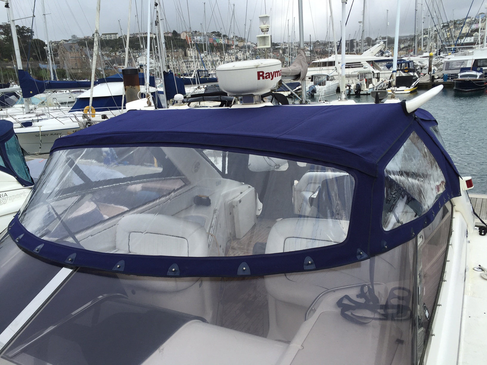 The Camper is supplied as original, manufactured from a choice of Sunbrella Plus fabric… The cover gives Full Standing Height in the cockpit, and is designed to create an additional living space in the entire cockpit. This particular version, covers from the top of the windscreen to the rear of the cockpit, supplied with Sun Awnings, removable screen, sides and rear, with zip doorway access, and with a full set of windows.