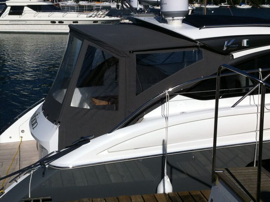 The Full Height Cockpit Camper is supplied as original, manufactured from a choice of Sunbrella Plus fabric… The cover gives Full Standing Height in the cockpit, and is designed to create an additional living space in the entire cockpit. This particular version, covers from the top of the cockpit overhang to the rear of the cockpit, supplied with Sun Awning, removable sides and rear, with zip doorway access, and with a full set of windows.