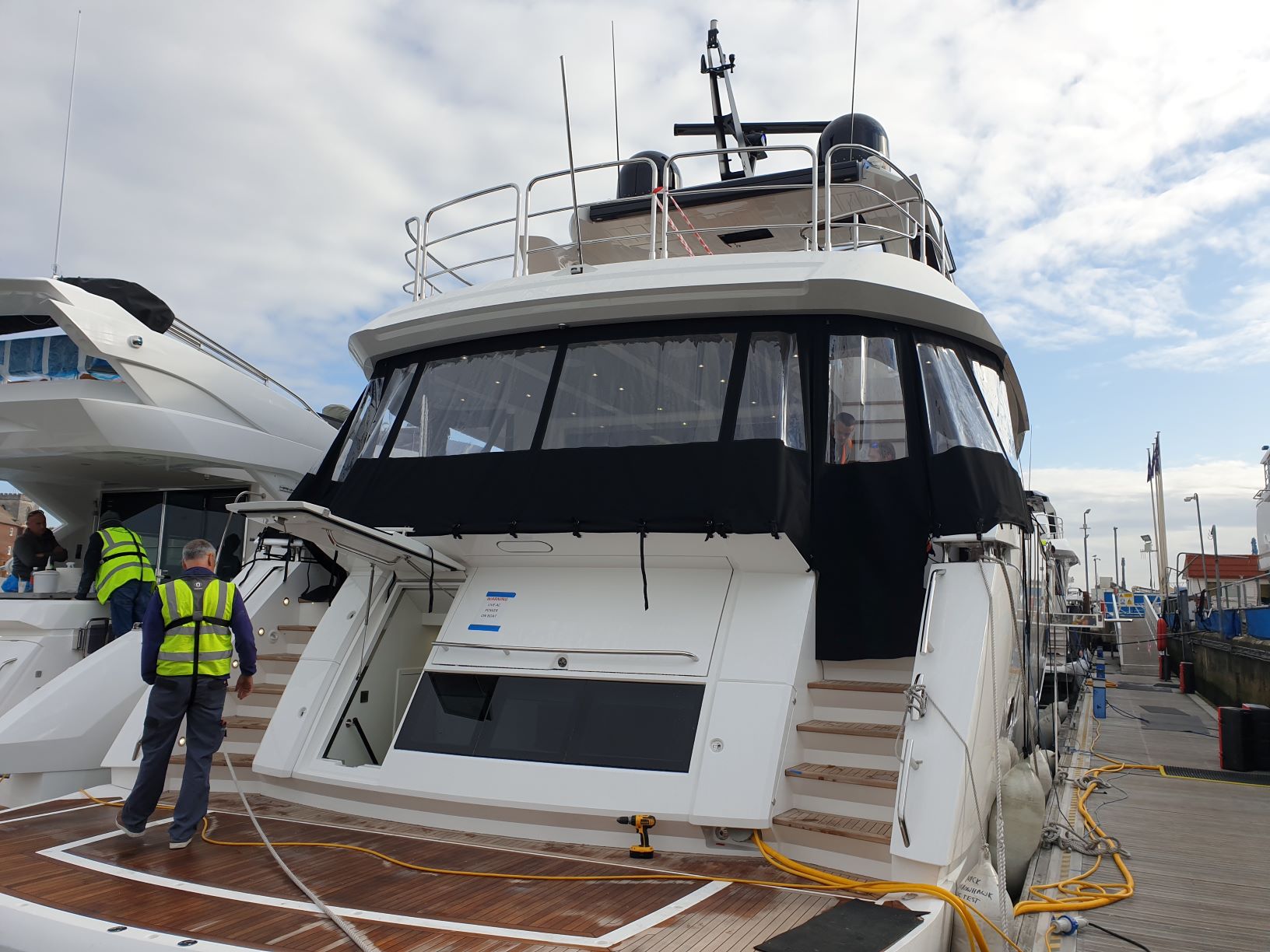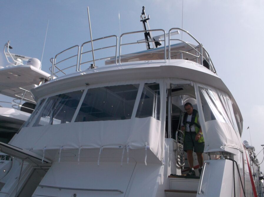 The Cockpit Camper is supplied as original, manufactured from a choice of Sunbrella fabric or Standard PVC… The Cockpit Camper cover is designed to cover the entire cockpit. It covers from Flybridge overhang to the rear of the cockpit, supplied with zip access doorways, and with a full set of windows.