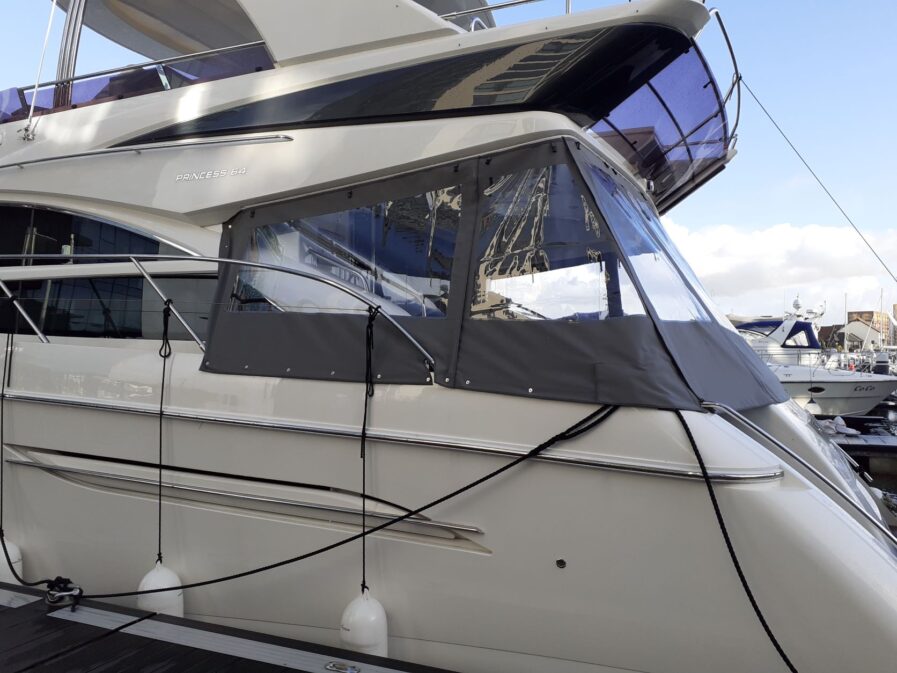 The Cockpit Camper is supplied as original, manufactured from a choice of Sunbrella fabric or Standard PVC… The Cockpit Camper cover is designed to cover the entire cockpit. It covers from Flybridge overhang to the rear of the cockpit, supplied with zip access doorways, and with a full set of windows.