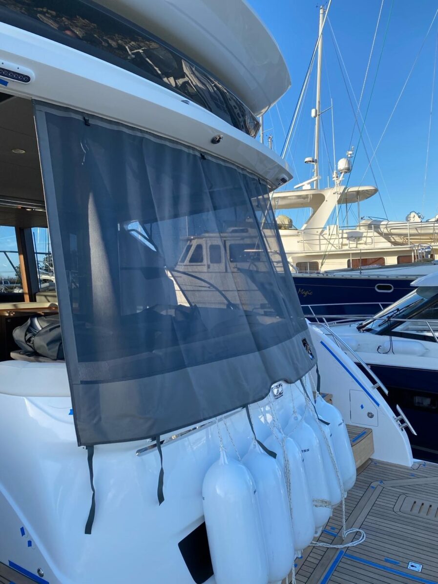 The Cockpit Privacy Screen is supplied as original, manufactured from a choice of Sunbrella fabric, PVC or Mesh… The Cockpit Privacy cover is a flat cover, designed to give an element of privacy and shade to the cockpit and saloon. It covers from the top of the cockpit overhang to the rear of the cockpit.