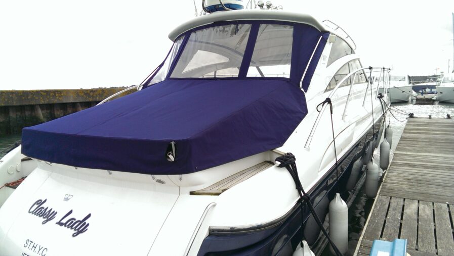 The Drop Door Partition Cover is supplied as original, manufactured from a choice of Sunbrella Plus fabric… The Drop Door – Partition Cover, is designed to enclose the forward part of the cockpit, aiding the air conditioning of this area, leaving the aft sun pads free for sun bathing. Covers from the top of the cockpit overhang to the rear of the cockpit seating, and is supplied with windows and a zip doorway.