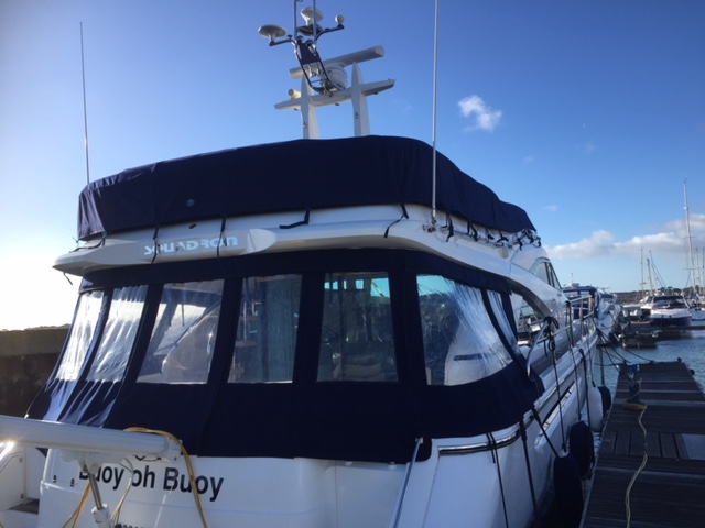 The Flybridge Tonneau can be manufactured from a choice of Sunbrella fabric, WeatherMax or Light Weight Valmex PVC… The Tonneau cover is a flat cover, designed to be a quick option to cover the entire Flybridge. This covers from the windscreen to the rear of the flybridge.