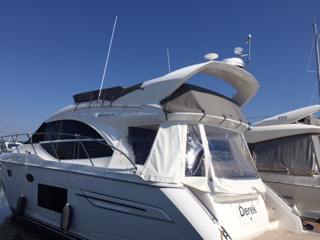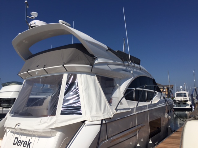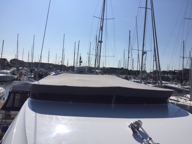 The Flybridge Tonneau can be manufactured from a choice of Sunbrella fabric, WeatherMax or Light Weight Valmex PVC… The Tonneau cover is a flat cover, designed to be a quick option to cover the entire Flybridge. This covers from the windscreen to the rear of the flybridge.