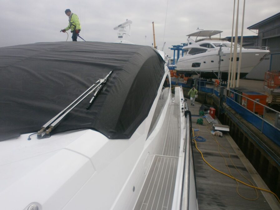 This Screen Cover Set is supplied as original, manufactured from a choice of Sunbrella Plus fabric, Sunshade or Standard PVC… The Windscreen cover set is designed to give an element of privacy and shade to the saloon and the cockpit helm, extending the full length of the top side screens. This cover also includes the hard top glass.
